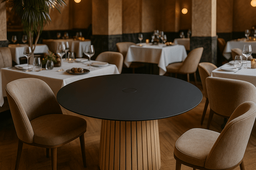 Round tabletop with sleek black surface and a sculpted base. A timeless luxury piece for fine dining environments.