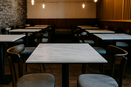 Rectangular marble tabletop with a structured finish. Combines durability with a timeless aesthetic for upscale dining environments.